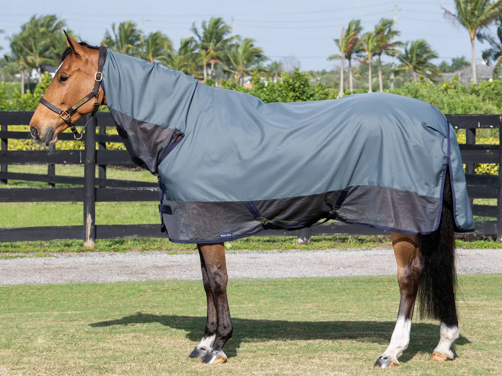 The Wellie-Wear Showerproof Combo Fly Sheet presents a clean, timeless silhouette while offering thoughtfully engineered protection for sun, light rain, and insects. A 600D showerproof top protects against unexpected weather, complemented by breathable scrim mesh sides that help maintain airflow, providing sensitive horses with added defense against biting insects and inclement weather. The attached neck is secured with a refined Velcro closure, and the T-bar front with elastic and a front Velcro panel supports an adjustable, streamlined fit. Elastic bias surcingles, removable leg straps, and a tail flap with a rope tail cord contribute to stable positioning and cohesive coverage, creating a polished combo design that blends functional comfort with classic style for versatile seasonal turnout.