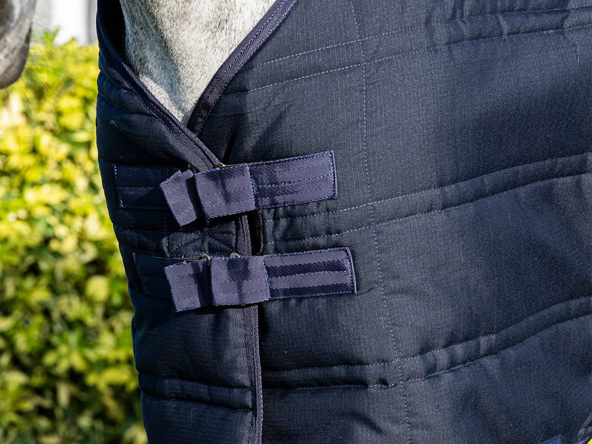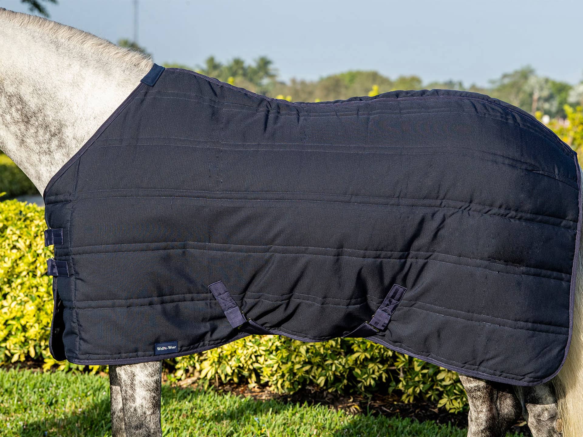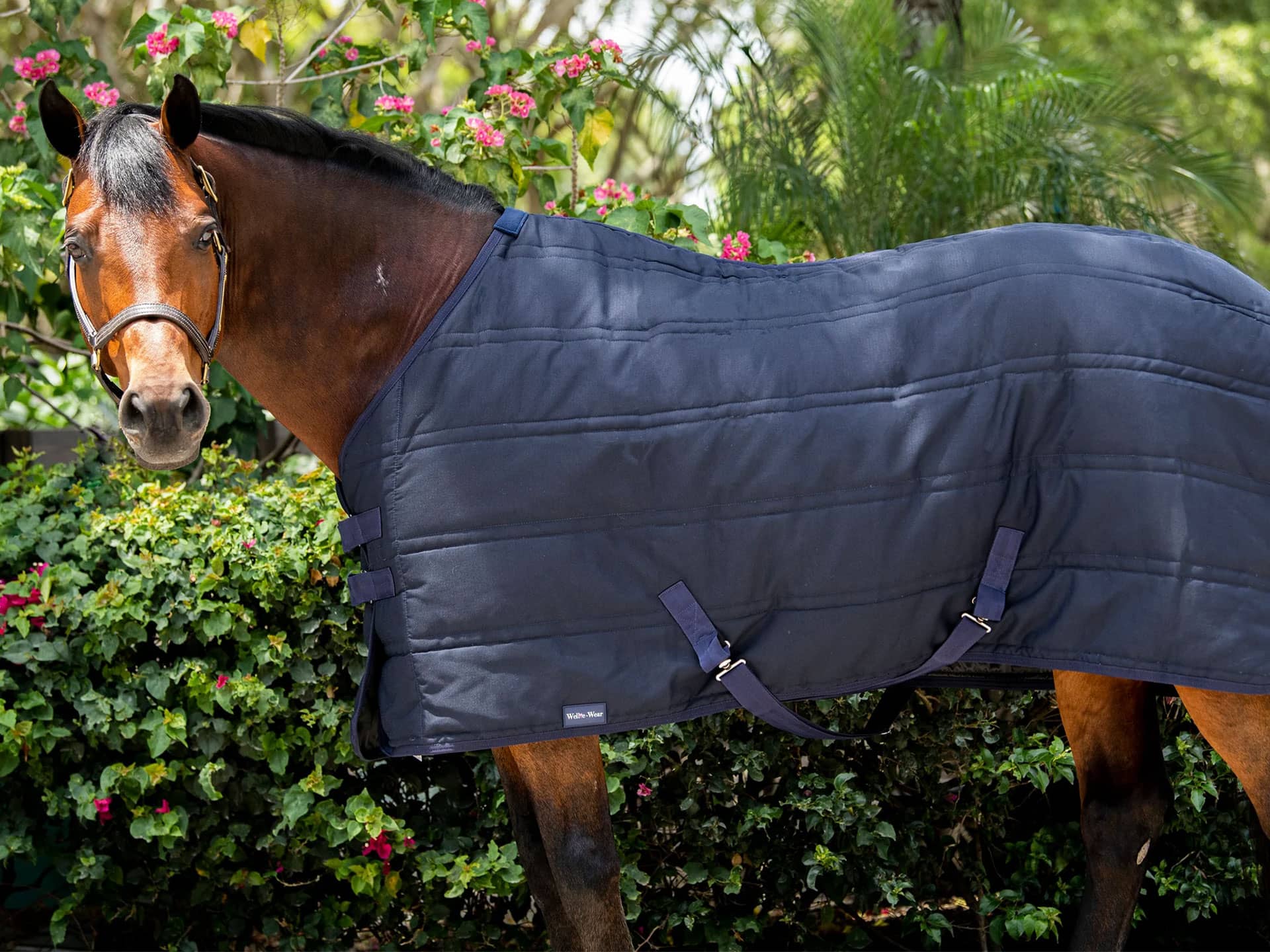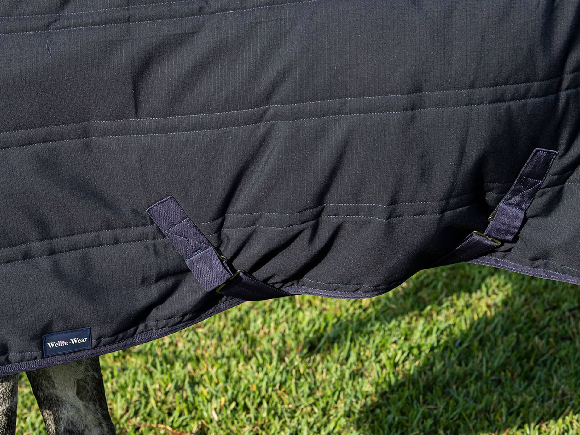 The Wellie-Wear Stable Blanket combines a classic quilted silhouette with 150g of lightweight insulation to maintain a neat, traditional look while offering gentle warmth in the barn. Its 600D outer shell pairs with a smooth nylon lining to help prevent rubbing and keep the coat polished, while dual T-bar front closures with elastic and a supporting Velcro tab create a clean, adjustable fit. The bias-cut surcingle with elastic inserts moves naturally with the horse without disrupting the blanket’s refined lines, and fleece wither protection adds soft cushioning along the top line. Finished with a simple rope tail cord, the stable blanket blends timeless style with thoughtful construction, making it an ideal layer for everyday stabling or use under additional blankets.