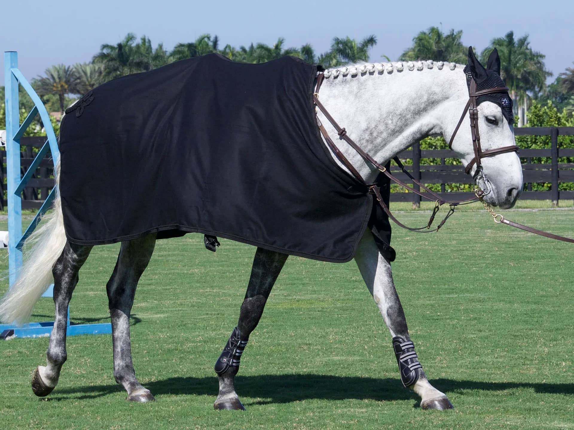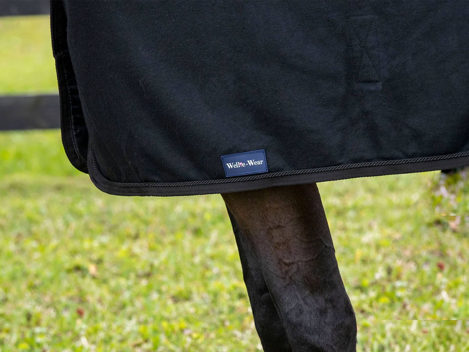 The Wellie-Wear Wool Dress Sheet offers a refined, classic layer that blends traditional elegance with functional comfort, perfect for show days or post-ride cool-downs. Constructed from medium-weight wool, it provides gentle warmth while allowing natural airflow to keep the horse comfortable. The front features a leather buckle complemented by a Velcro tab for a secure fit, while a hidden surcingle maintains a smooth top line. Finished with nylon trim, subtle rope piping, a decorative hip accent, and a coordinating tail cord, the wool dress sheet showcases thoughtful craftsmanship and sophisticated detailing, delivering a timeless, polished appearance for every season.